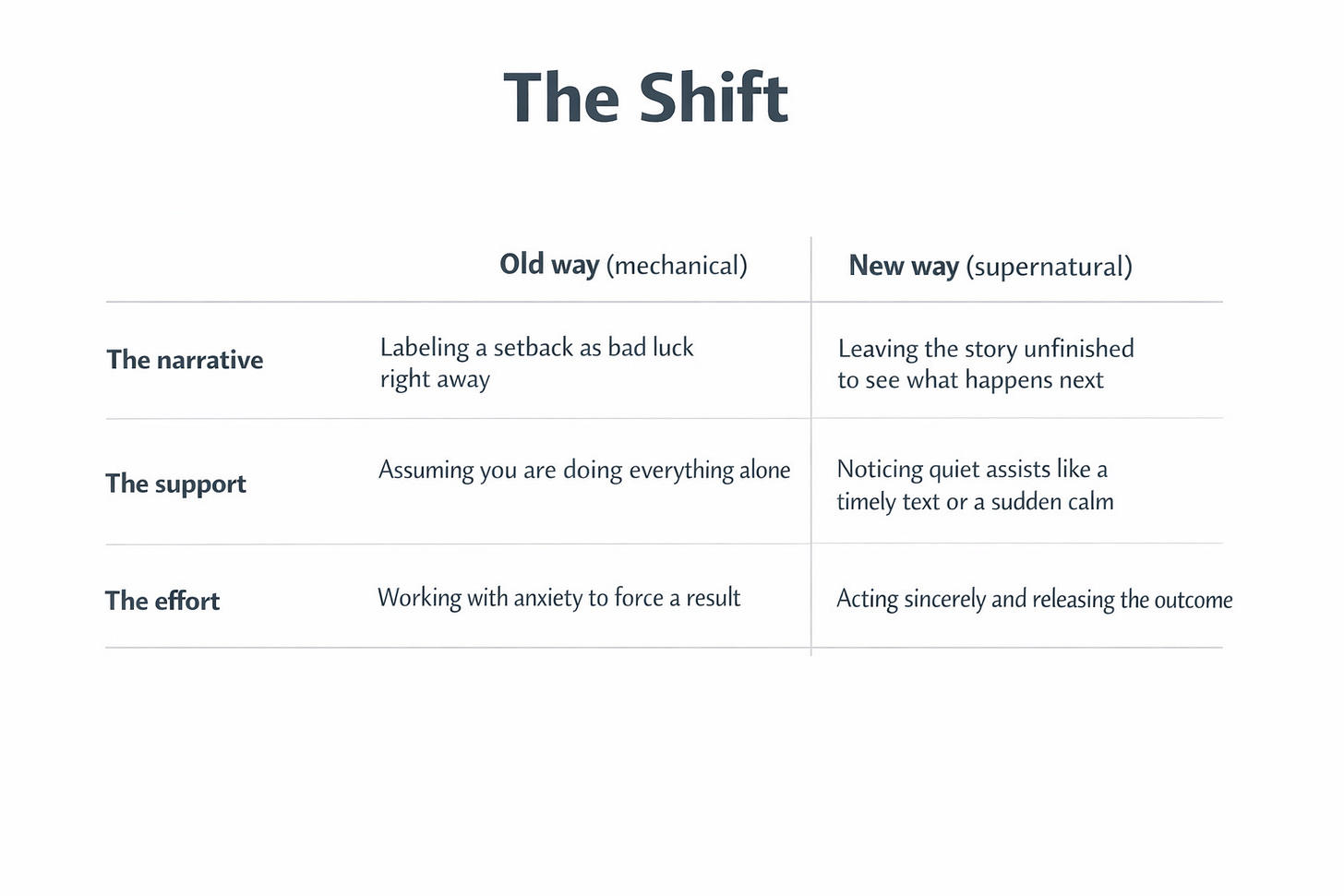 When something difficult or disappointing happens, our ego rushes to label it a tragedy or a nuisance. A miracle mindset keeps the experience open. It allows time for context to change and for a larger arc to reveal itself. This pause is where the supernatural has room to breathe. Next week, I’ll share with you a great story by Anthony De Mello that articulates this perfectly.